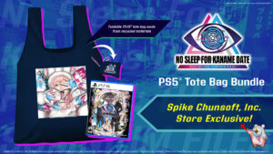 Get the No Sleep For Kaname Date – From AI: THE SOMNIUM FILES PS5 Tote Bag Bundle, available exclusively through the Spike Chunsoft Official Store. Includes a physical edition for PlayStation®5 and a tote bag. The MSRP for the PS5 Tote Bag Bundle is $64.99. Visit the Spike Chunsoft Official Store for details.